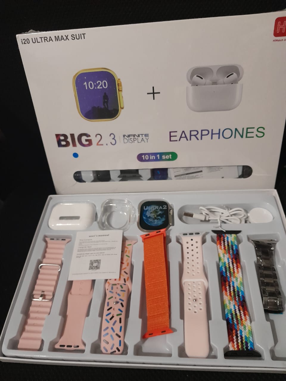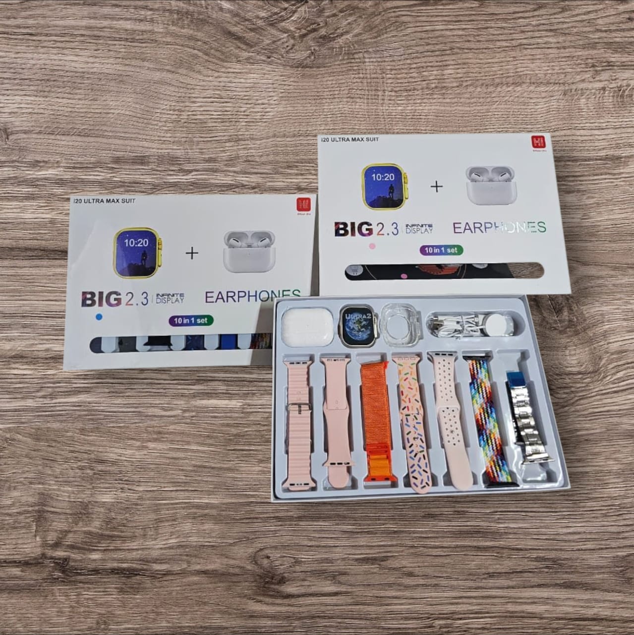 El i20 Ultra Max Suit es un combo premium que combina tecnología, estilo y comodidad en un solo paquete. Con su pantalla gigante de 2.3" Infinite Display, múltiples correas intercambiables y auriculares inalámbricos incluidos, tendrás todo lo que necesitás para estar conectado con estilo.